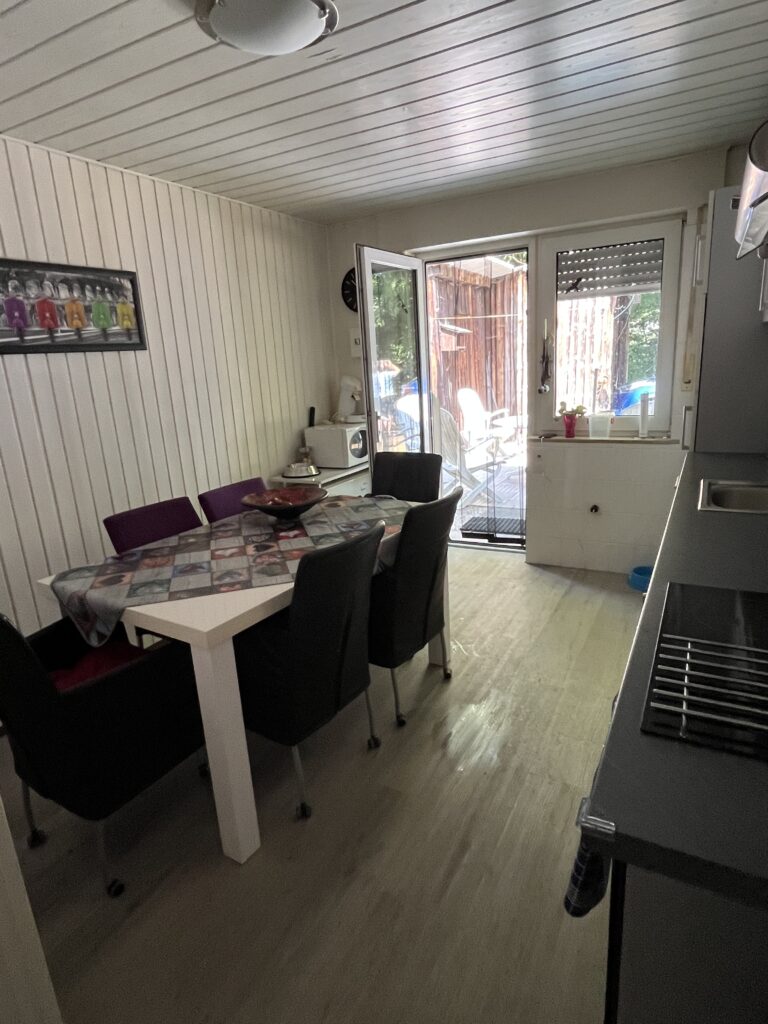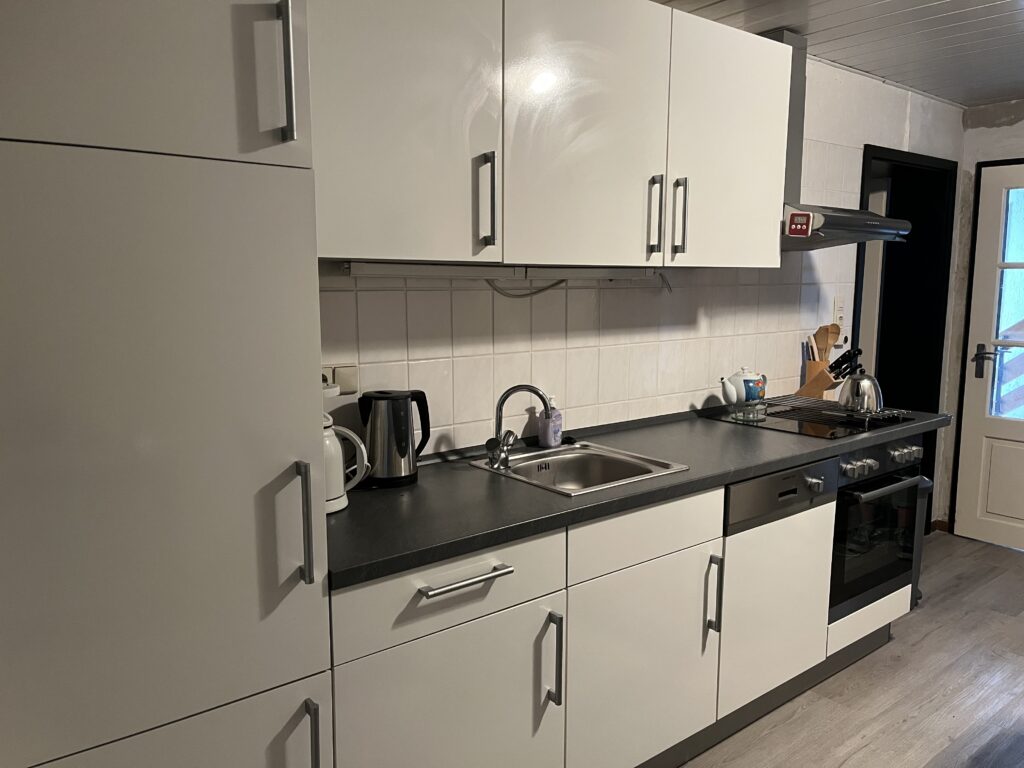 De begane grond beschikt ook over een praktische douche met ligbad en toilet. Ideaal voor extra comfort en gemak tijdens je verblijf. De keuken is modern en volledig uitgerust, zodat je eenvoudig een maaltijd kunt bereiden en gezellig kunt dineren aan de eettafel.
