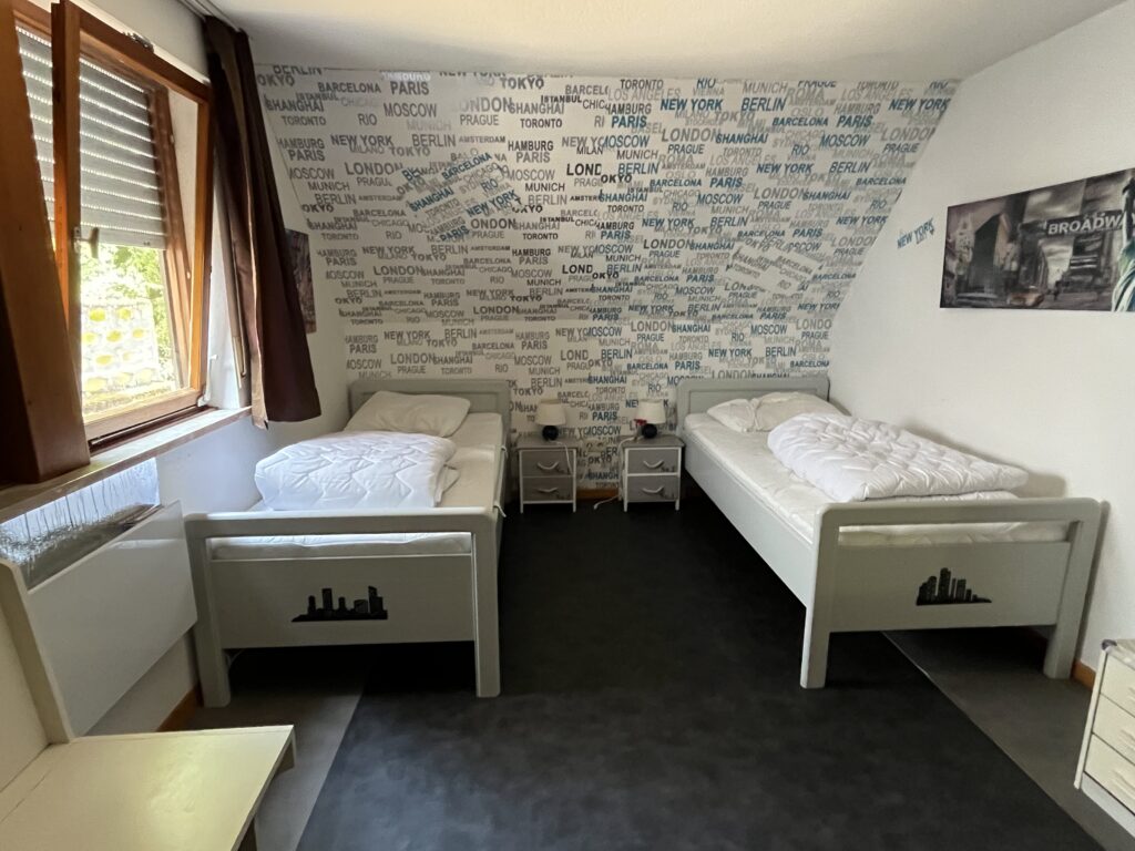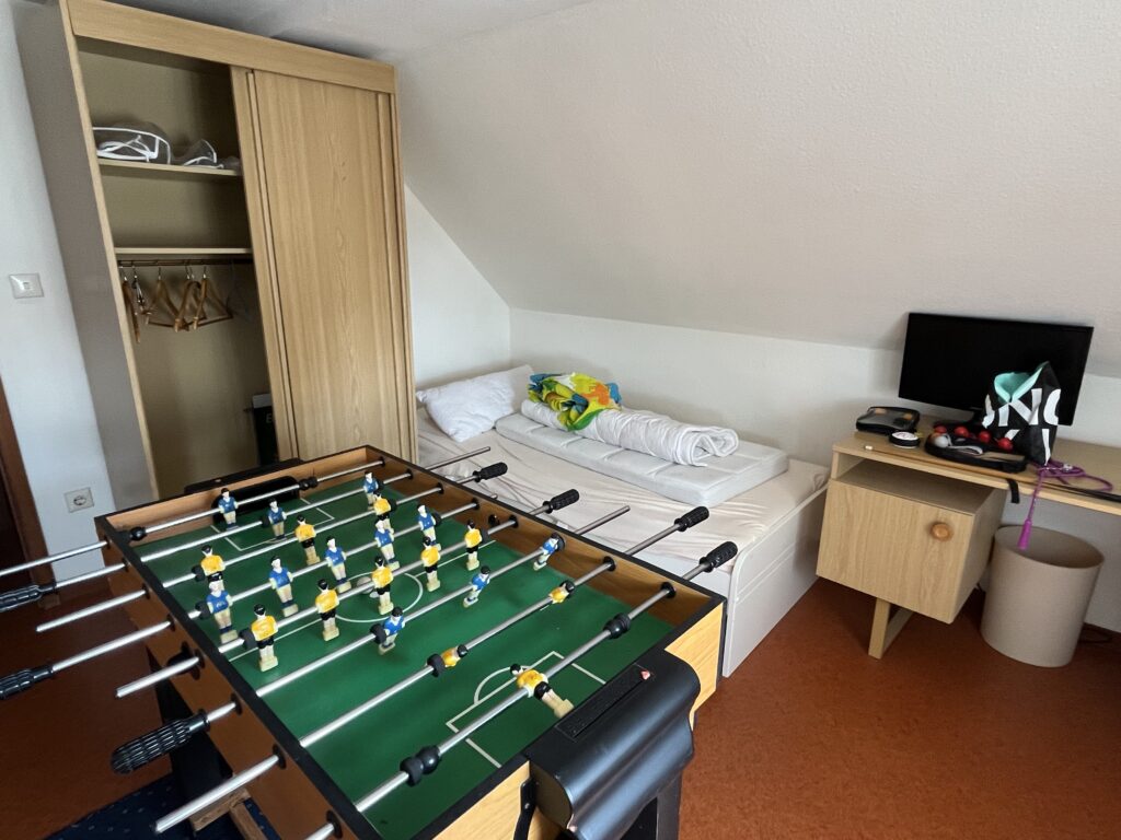 Op zolder bevindt zich nog een slaapkamer met een tweepersoonsbed , een eenpersoonsbed en speelmogelijkheden.